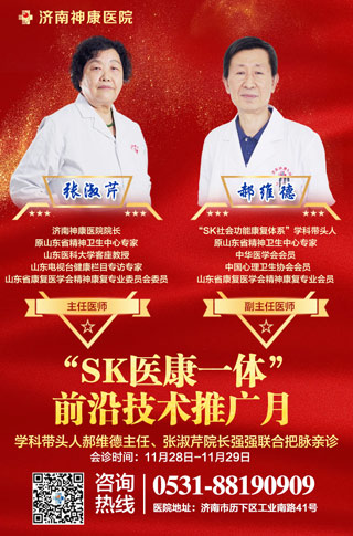 为贯彻实现十九大提出的“加强社会心理服务体系建设”总体目标,有效降低各类精神障碍及肇事肇祸事件的发生,帮助我省精神疾病患者真正实现临床治愈与社会功能的全面康复,济南神康医院特别启动“SK医康一体”前沿技术推广月,倾力搭建精神名医联合会诊平台,本周末(28日、29日)“SK医康一体”学科带头人、原山东省精神卫生中心郝维德主任,原山东省精神卫生中心主任医师、济南神康医院张淑芹院长强强联合,为疑难精神疾病患者把脉亲诊,机会难得,每日限20个名额,抢约热线:0531-88190909!
